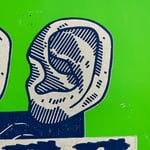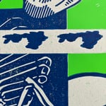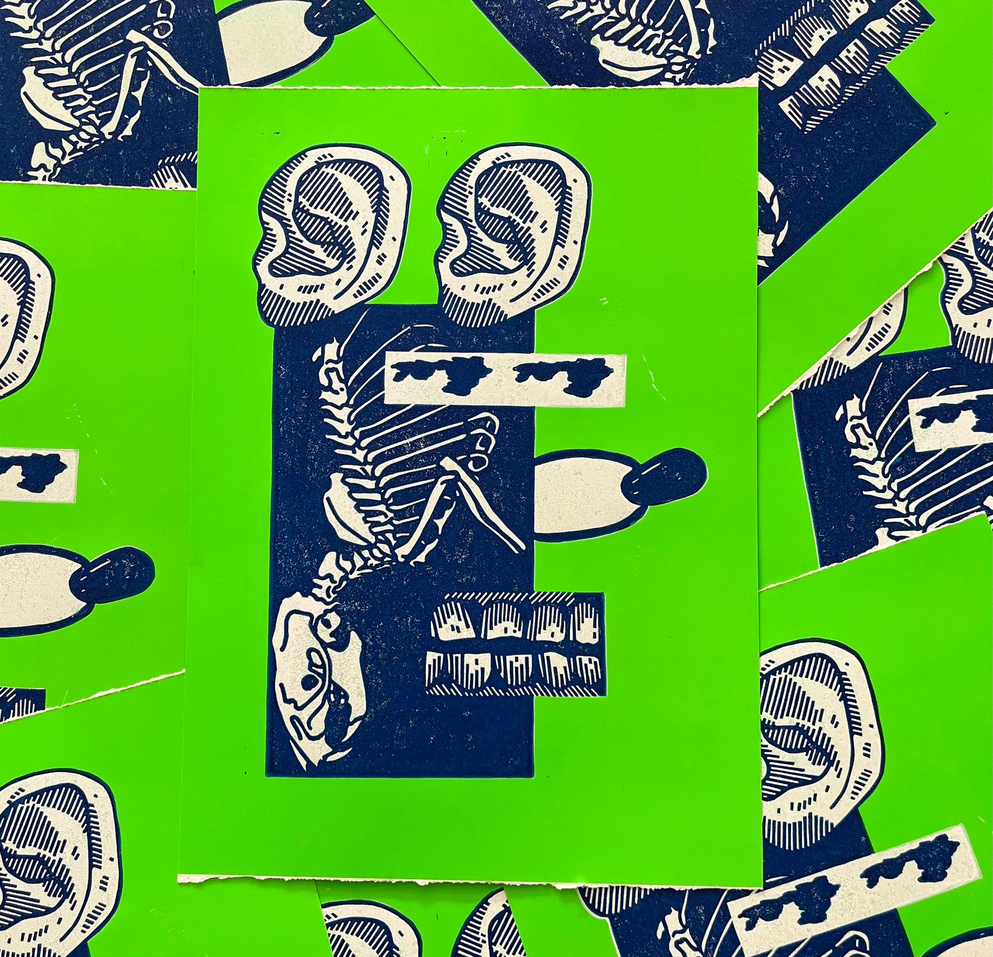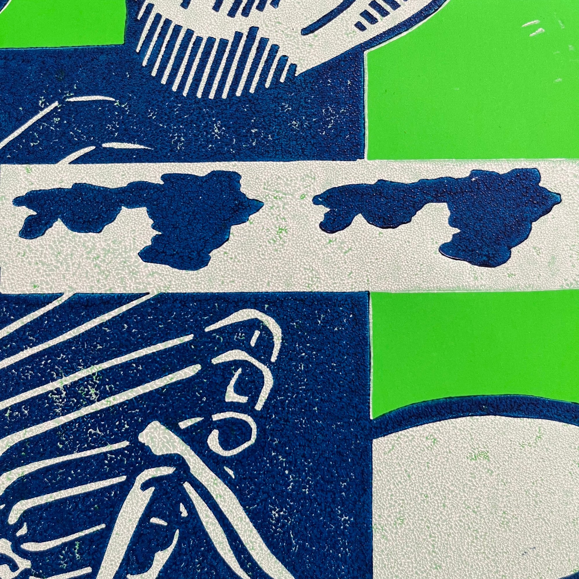 37x26.5cm, 2 colour Lino relief print. Printed on green fluro card stock.